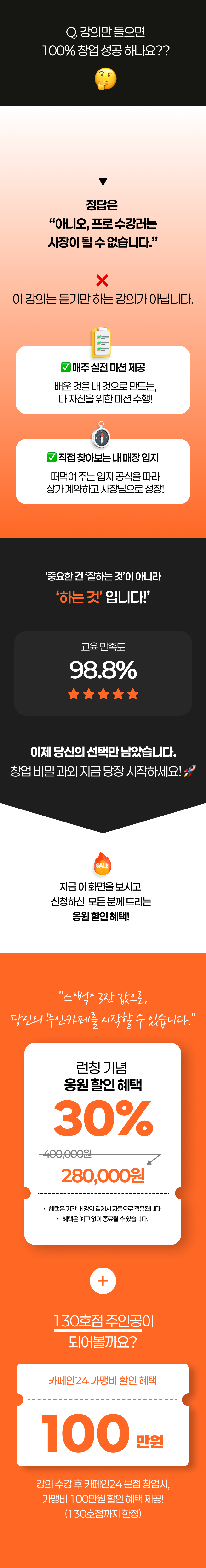 강의 수강 후 카페인24 분점 창업시, 가맹비 100만원 할인 혜택 제공!